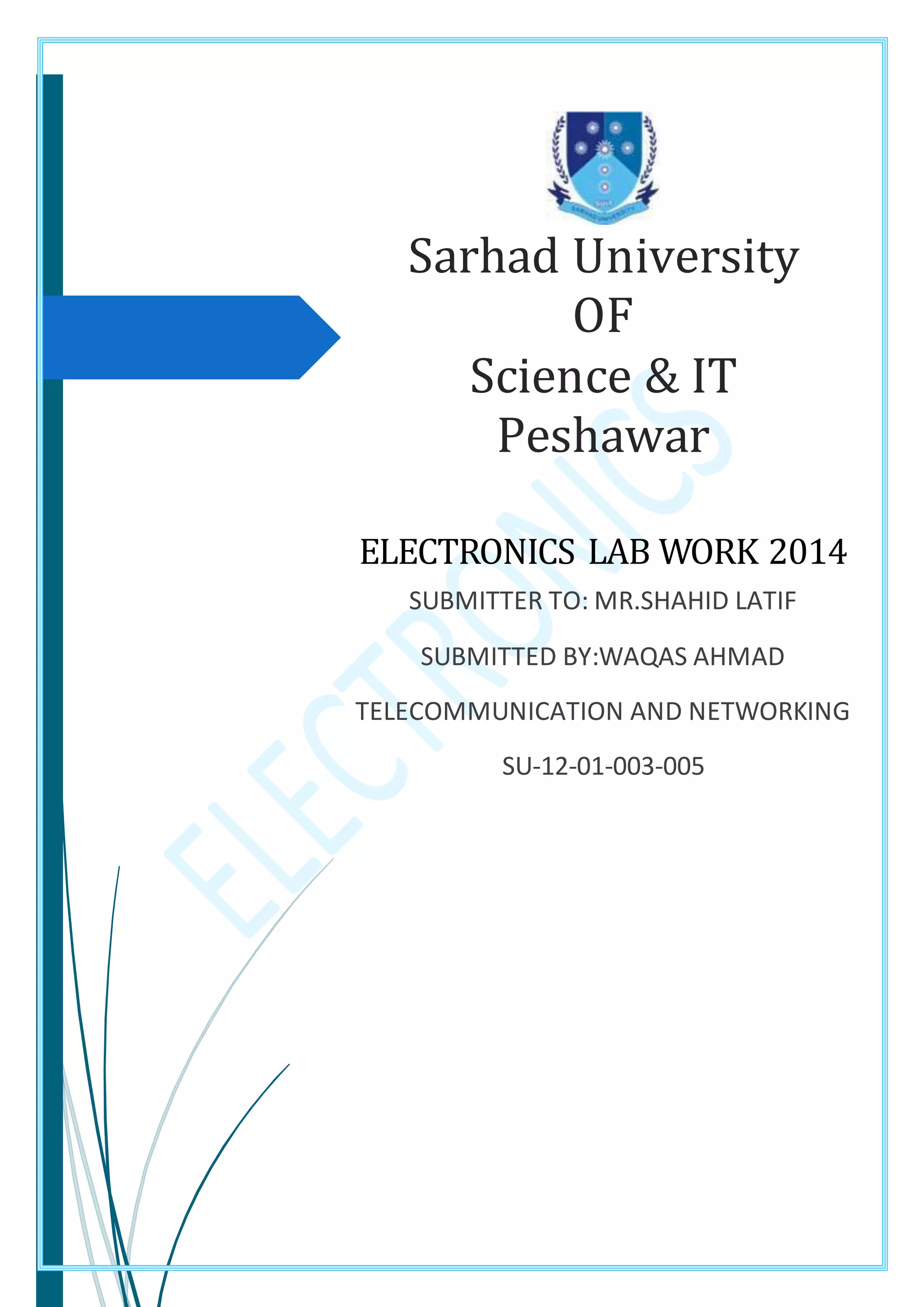 This document contains a lab report submitted by Waqas Ahmad to Mr. Shahid Latif for an electronics lab at Sarhad University of Science & IT in Peshawar. The report describes 9 lab experiments conducted on various electronic components and circuits, including calculating resistor values using color coding and a multimeter, investigating the characteristics of a PN junction diode, studying half-wave and full-wave rectifier circuits using a diode and transformer, understanding clipper and clamper circuits, and investigating how a transistor can work as a switch. Diagrams and data tables are provided for each experiment.