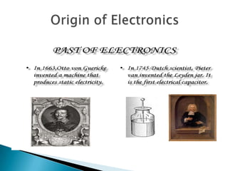 This document discusses the history and development of electronics from Thomas Edison's invention of the light bulb to modern integrated circuits and microprocessors. It outlines the benefits of electronics like time conservation and access to information, as well as drawbacks like processing time and bulky early gadgets. The document also examines current and future technologies including VLSI circuits, broadband communication, and advances in computing, and concludes that while electronics provide advantages, precautions must be taken regarding security, privacy, and environmental impact.