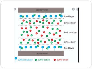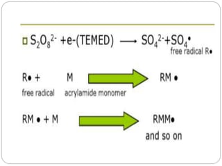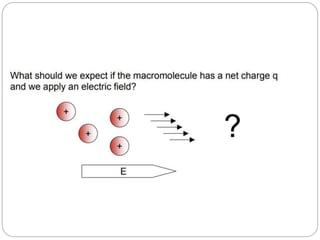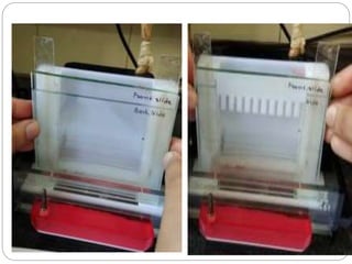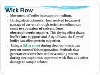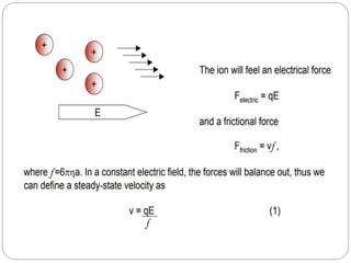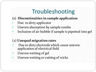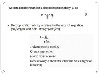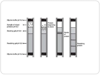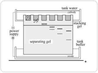 This document provides an overview of electrophoresis techniques. It begins with an introduction to electrophoresis as the migration of charged particles under an electric field. It then discusses various factors that affect electrophoresis like net charge, size, strength of electric field, buffer properties, and temperature. It describes different types of electrophoresis like paper, gel, cellulose acetate, isoelectric focusing, and moving boundary electrophoresis. Specific details are given about gel electrophoresis techniques like agarose, polyacrylamide gel, and SDS-PAGE electrophoresis. Other techniques like isolectric focusing, two-dimensional electrophoresis, isotachophoresis, pulsed field gel electrophoresis, and immunoelectrophoresis are also summarized briefly in 3 sentences