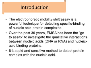The electrophoretic mobility shift assay (EMSA) is a sensitive and rapid technique used to detect specific-binding interactions between nucleic acids (DNA or RNA) and proteins. The assay separates protein-nucleic acid complexes from unbound nucleic acids through non-denaturing gel electrophoresis, allowing for the visualization of binding events. EMSA is widely utilized for analyzing protein-DNA interactions, but has limitations such as influencing factors on mobility and the inability to measure protein weights directly.