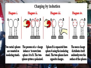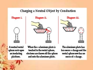 This document discusses electrostatic charging and the differences between conductors, insulators, and semiconductors. Electrostatic charging is the process by which an insulator or insulated conductor gains a net electric charge. Materials are charged through friction, contact/conduction, induction, or polarization. Conductors allow electric charge to move through them, insulators do not, and semiconductors fall in between. Charging can be demonstrated using an electroscope and is useful in applications like electrostatic precipitation to clean air.