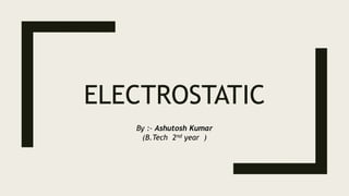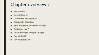 This document provides an overview of the key topics in electrostatics that will be covered in a chapter, including: electric charge, conductors and insulators, charging by induction, Coulomb's law, forces between multiple charges, electric fields, electric field lines, and electric field configurations such as those due to point charges, dipoles, conductors, and various charge distributions like shells and spheres. Formulas for calculating electric fields are presented.
