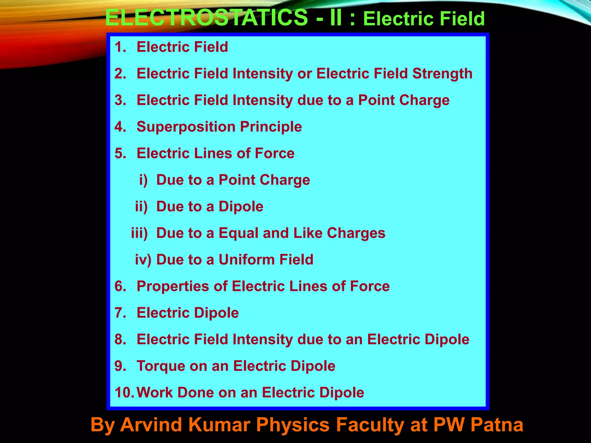 This document discusses the concepts of electrostatics including electric field, electric field intensity, electric field due to point charges, the superposition principle, electric lines of force, properties of electric lines of force, electric dipoles, electric field intensity due to dipoles, torque on dipoles, and work done on dipoles. It defines key terms and concepts and provides examples and equations to illustrate electric field and force calculations for various charge configurations including point charges and dipoles.