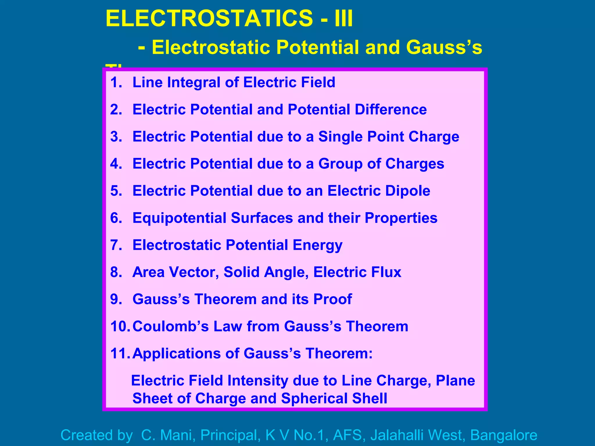1. The document discusses various topics in electrostatics including line integrals of electric fields, electric potential and potential differences, Gauss's theorem, and applications of Gauss's theorem.
