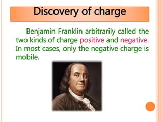 4. Charging can occur through friction, conduction, or induction. Coulomb's law describes the electrostatic force between two charges, and electric fields are defined as force per unit charge.