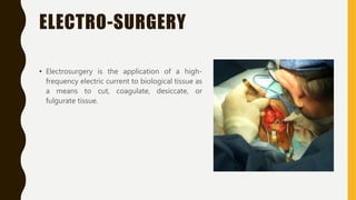 Electro-surgery uses high frequency electric current to cut, coagulate, desiccate, or fulgurate tissue. The generator converts electricity to high frequency waveforms over 30,000 cycles per second. Tissue effects are regulated by current, power, modulation level, electrode shape and condition, cutting speed, and tissue properties. Monopolar electro-surgery uses an active electrode at the surgical site and a return electrode elsewhere to complete the circuit. Bipolar electro-surgery contains active and return electrodes within the instrument to limit current flow. Proper use and maintenance of equipment, along with correct patient positioning and electrode application, are necessary to avoid risks like unintended burns.