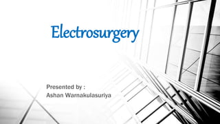 Electrosurgery uses high-frequency alternating electrical current to cut, coagulate, or vaporize tissue. It allows for precise cuts with limited blood loss. The current is delivered via an electrosurgery generator to an active electrode and returns through the patient to a neutral electrode. Different waveforms and modes, such as cut, coagulate, and blend, are used depending on the desired tissue effect. Safety features monitor for excess heat buildup and electrode detachment to prevent patient injury.