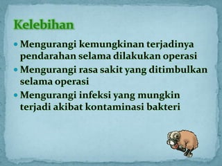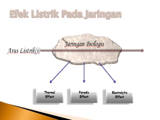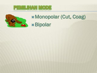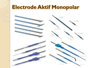 Dokumen ini membahas tentang pengendalian dan pengaturan sinyal input pada alat bedah electrosurgery unit (ESU) untuk menghasilkan output sesuai kebutuhan pengguna. Terdapat penjelasan mengenai prinsip kerja, jenis-jenis elektroda, pemilihan mode, serta prosedur operasional dan pemeliharaan alat. Kesimpulan menekankan pentingnya integrasi komunikasi antar bagian alat untuk memastikan fungsi yang optimal dan aman selama penggunaan.