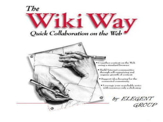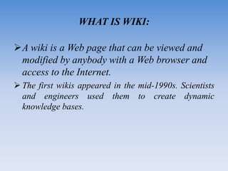 A wiki is a webpage that can be viewed and edited by anyone with internet access. Wikis first appeared in the mid-1990s and were used by scientists and engineers to create collaborative knowledge bases. This document provides instructions on how to personalize and customize a wiki, including adding files and pictures, and outlines some advantages like improved knowledge sharing and processes, as well as disadvantages like vulnerability to accidental damage or unauthorized edits.