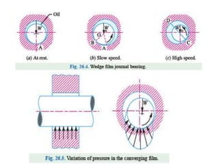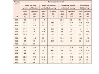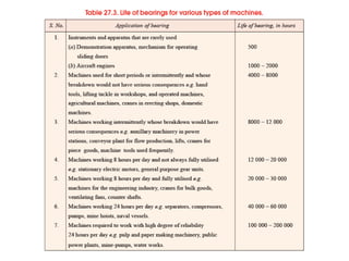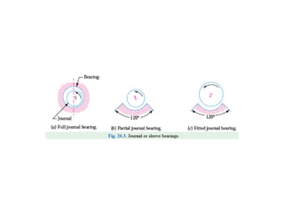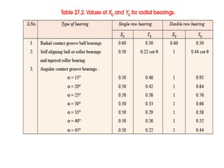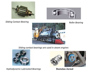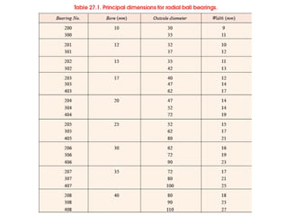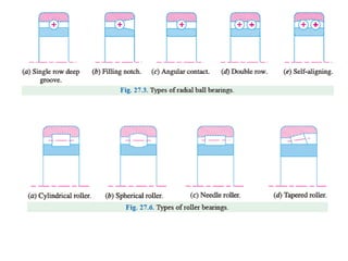 This document discusses different types of bearings used in mechanical systems. It describes sliding contact bearings and rolling contact bearings. Rolling contact bearings are further divided into ball bearings and roller bearings. The key advantages of rolling contact bearings over sliding contact bearings are their lower starting friction and operating friction, ability to withstand shock loads, and reliability. Radial bearings support radial loads while thrust bearings support axial loads. Common types of radial ball bearings are single row deep groove bearings and filling notch bearings.