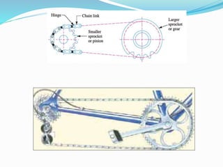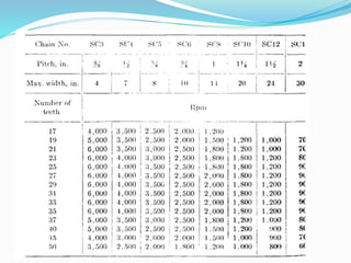 Dokumen ini membahas penggerak daya dengan rantai, menjelaskan fungsi dan keuntungan penggunaannya, termasuk variasi kecepatan rantai berdasarkan jumlah gigi sproket. Selain itu, disertakan perhitungan untuk merancang penggerak rantai yang digunakan dalam aplikasi industri, seperti menggerakkan kompresor dari motor listrik. Terdapat rumus dan contoh untuk menentukan spesifikasi yang diperlukan bagi sistem rantai yang efisien.
