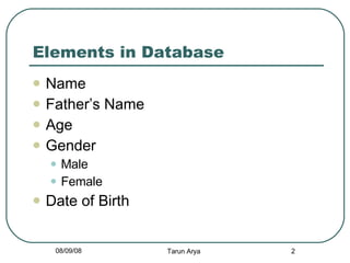 The document discusses the elements that would be included in a customer database, such as names, contact information, demographics, preferences, and transaction history. It outlines potential sources for populating the database, like customer interactions, salespeople, and public records. Maintaining a customer database provides several advantages like increased sales, customization, and insights to inform business decisions. It also discusses the relevance of a customer database for a business-to-consumer market, such as segmenting customers, measuring promotions, and notifying customers of new products or offers.