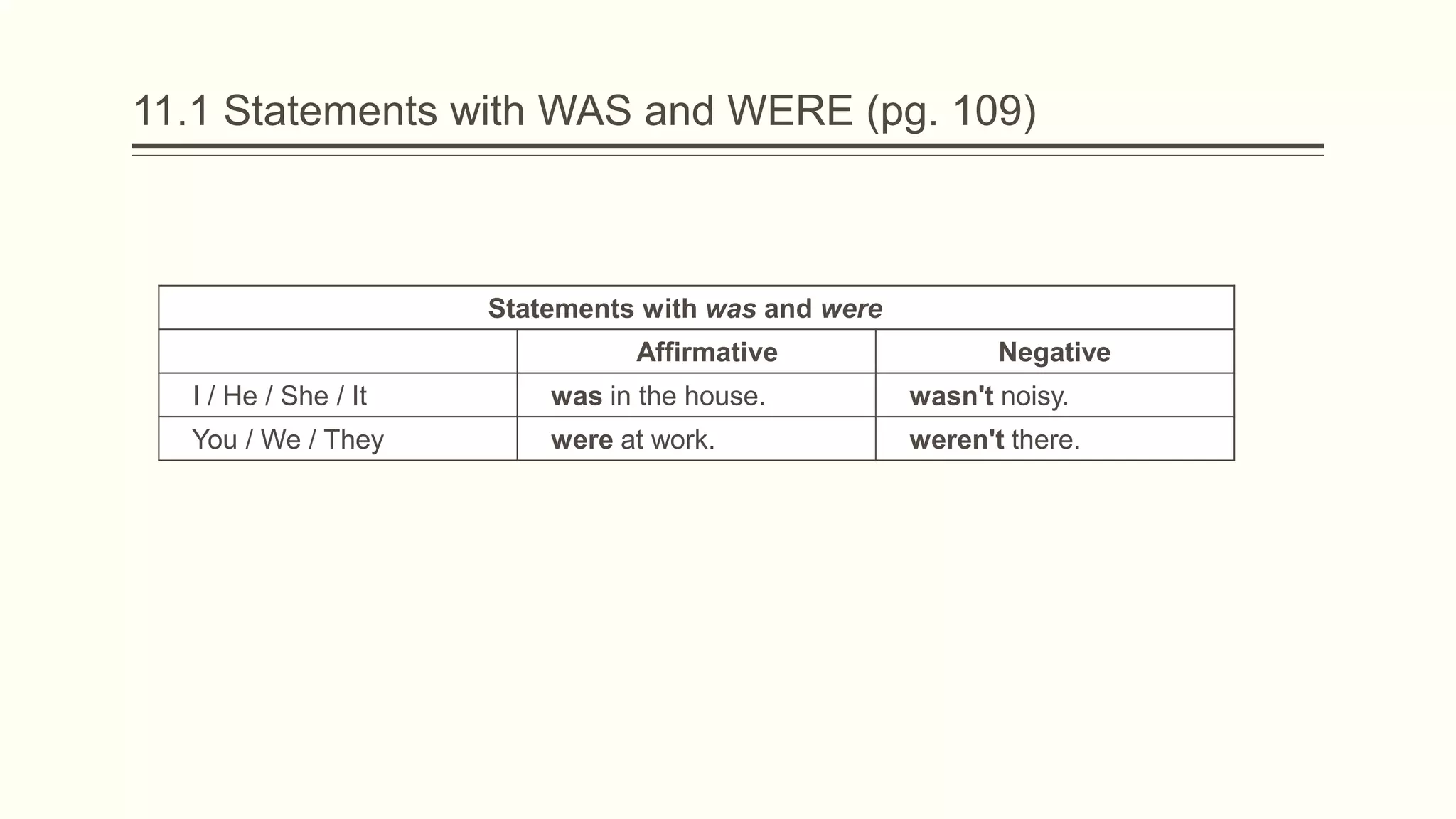 This document provides a grammar reference for using was and were in statements, questions, and short answers in the past tense. It outlines the rules for forming affirmative and negative statements with was and were depending on the subject. It also shows how to form yes/no and information questions with was and were, including examples of short answers for yes/no questions.