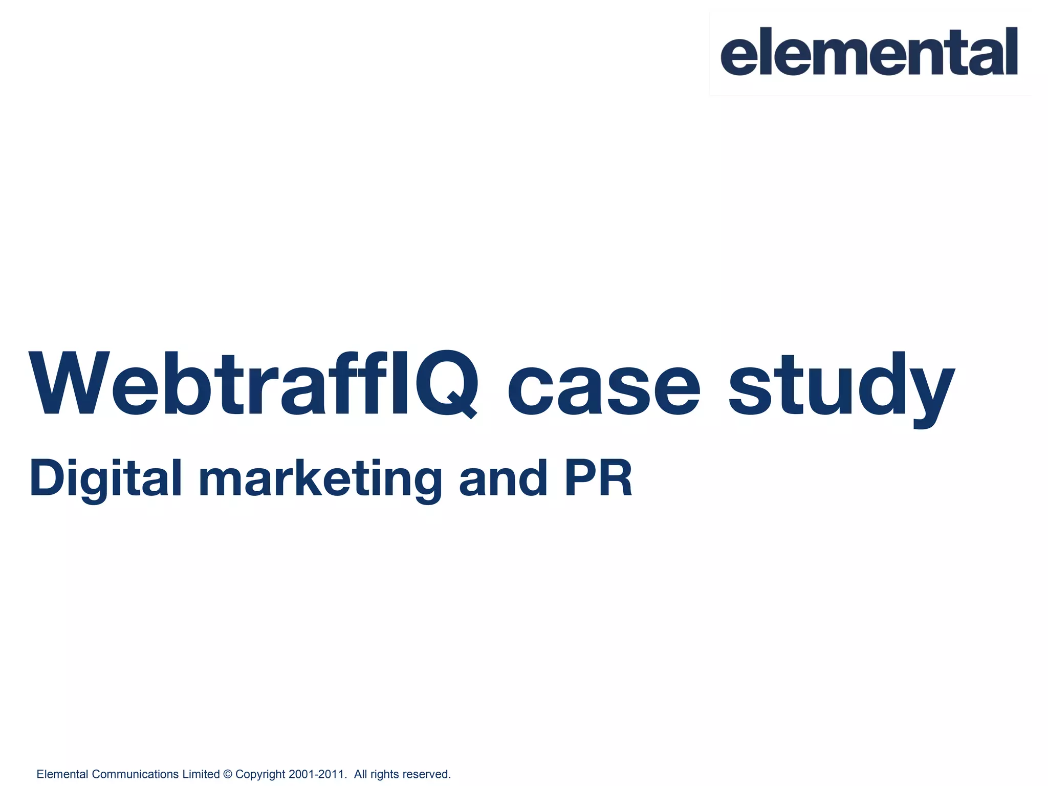 WebtraffIQ is a start-up web analytics company founded in 2002 that provides services to major brands. Elemental was hired to help build the WebtraffIQ brand through media relations, PR campaigns, and establishing the company and its spokespeople as experts in the field of web analytics. Over a three year period, Elemental secured over 150 print mentions for WebtraffIQ and generated a ROI of over 1300% through its communications work, helping WebtraffIQ become one of the top web analytics firms in the UK and leading to its successful acquisition in 2006.