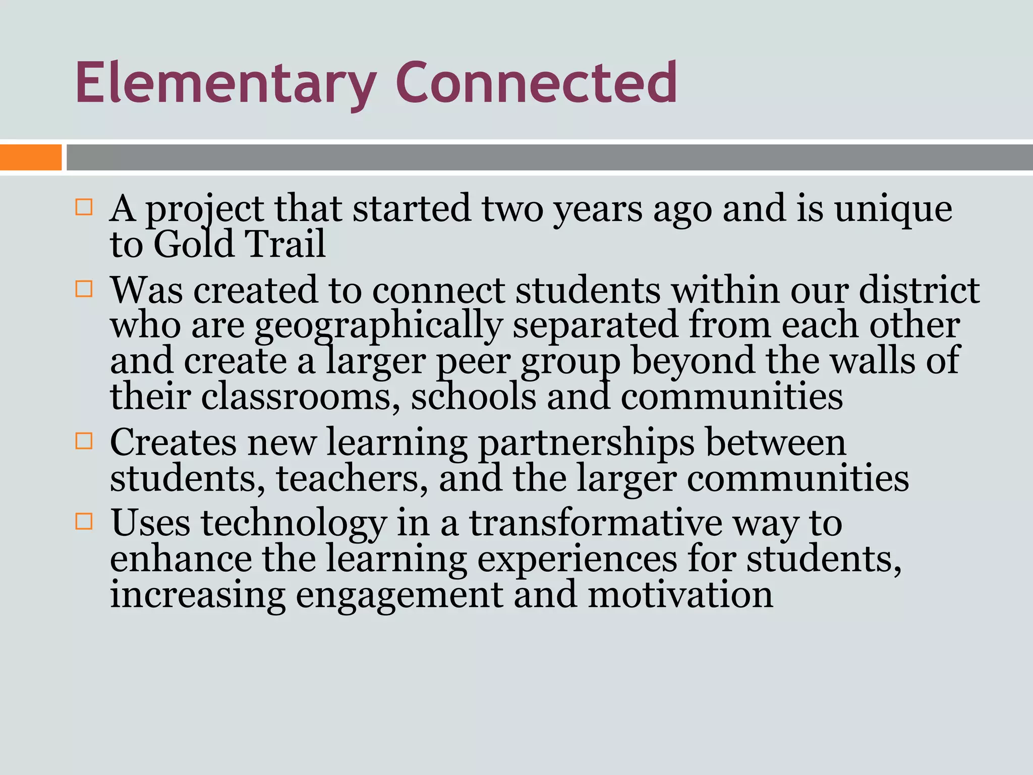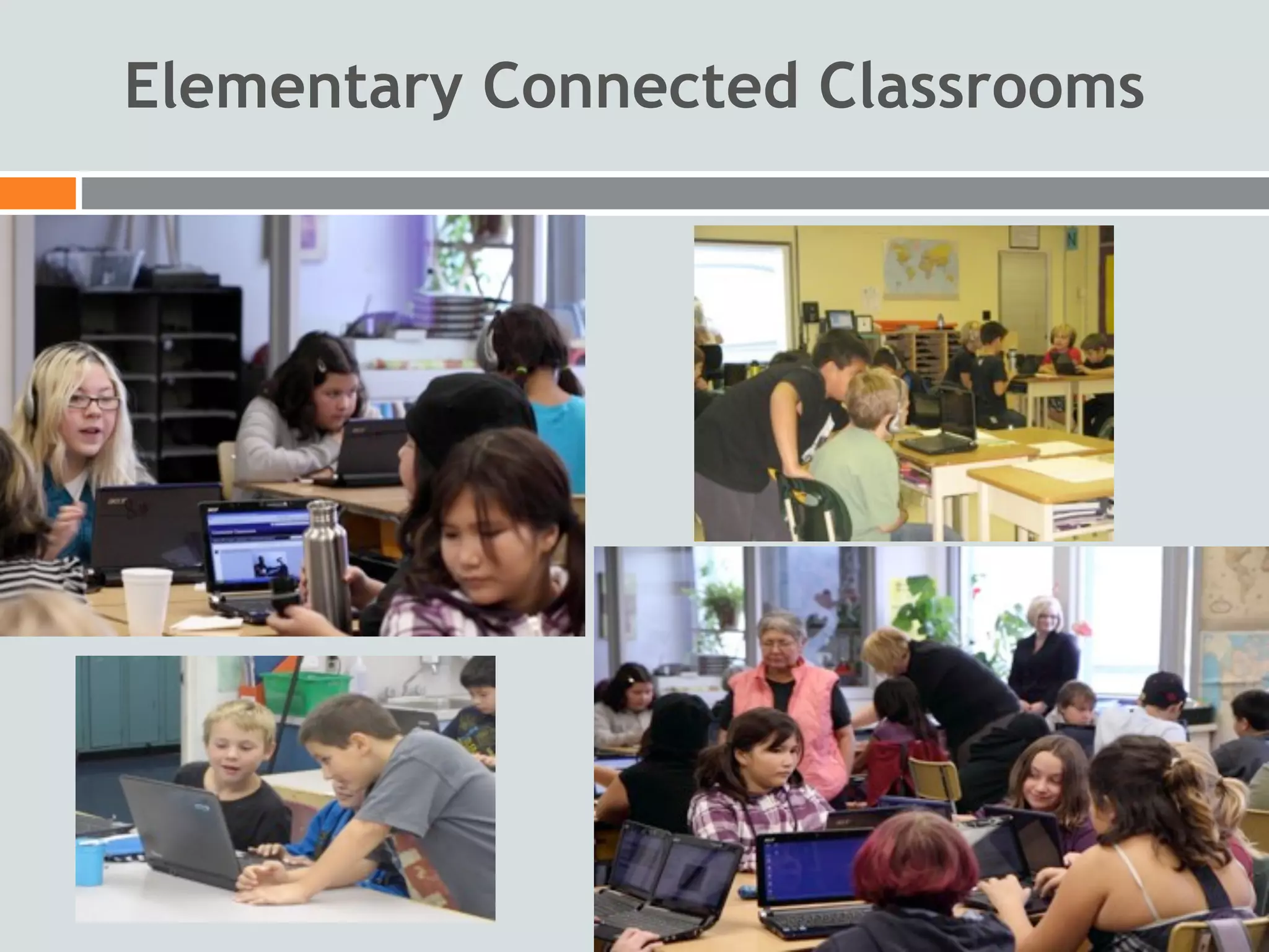 The Elementary Connected Classrooms project connects students from three elementary schools in different communities through technology. Students engage in lessons four times a week led by teachers with different areas of expertise. They also participate in weekly online forums to discuss current events, literature circles, and other topics. The goals are to enhance learning experiences, increase engagement, and build relationships between widely separated student groups. Technology like laptops, video conferencing, and online platforms allow for shared lessons and collaborative projects across many miles.