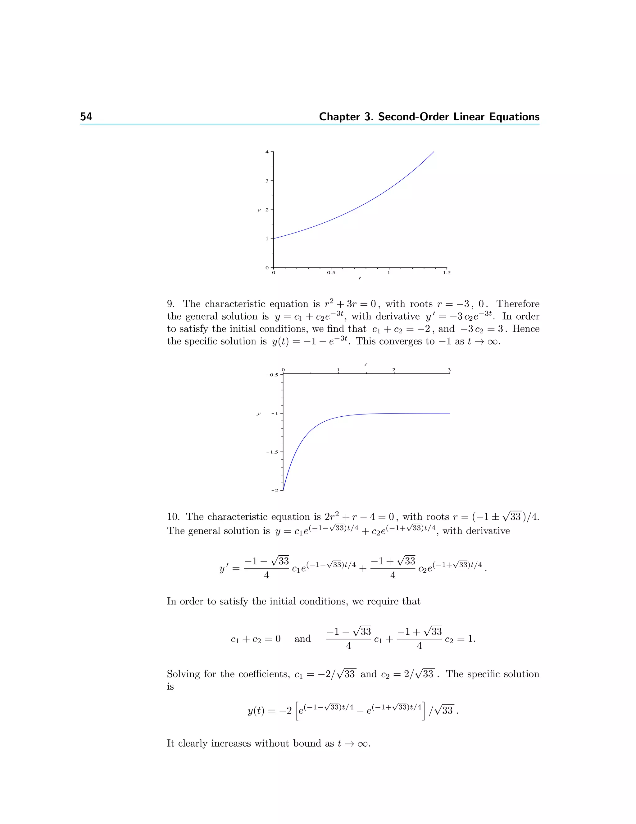 The document discusses second-order linear differential equations, providing various examples of characteristic equations and their corresponding general solutions. It includes substitutions, methods to satisfy initial conditions, specific solutions, and conditions under which solutions become unbounded or tend to zero. Additionally, it elaborates on the Wronskian, differentiating solutions, and includes analyses on convergence and maximum values.