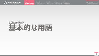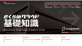 VERSION E l e m e n t a r y k n o w l e d g e o f S a k u ra C l o u d |No.2 IDとアカウント |No.4 サーバ仕様 |No.1 基本的な用語 |No.5 障害耐性 2017/8/17 さくらインターネット株式会社 2017 8さくらのクラウド |No.3 ネットワーク 基礎知識
