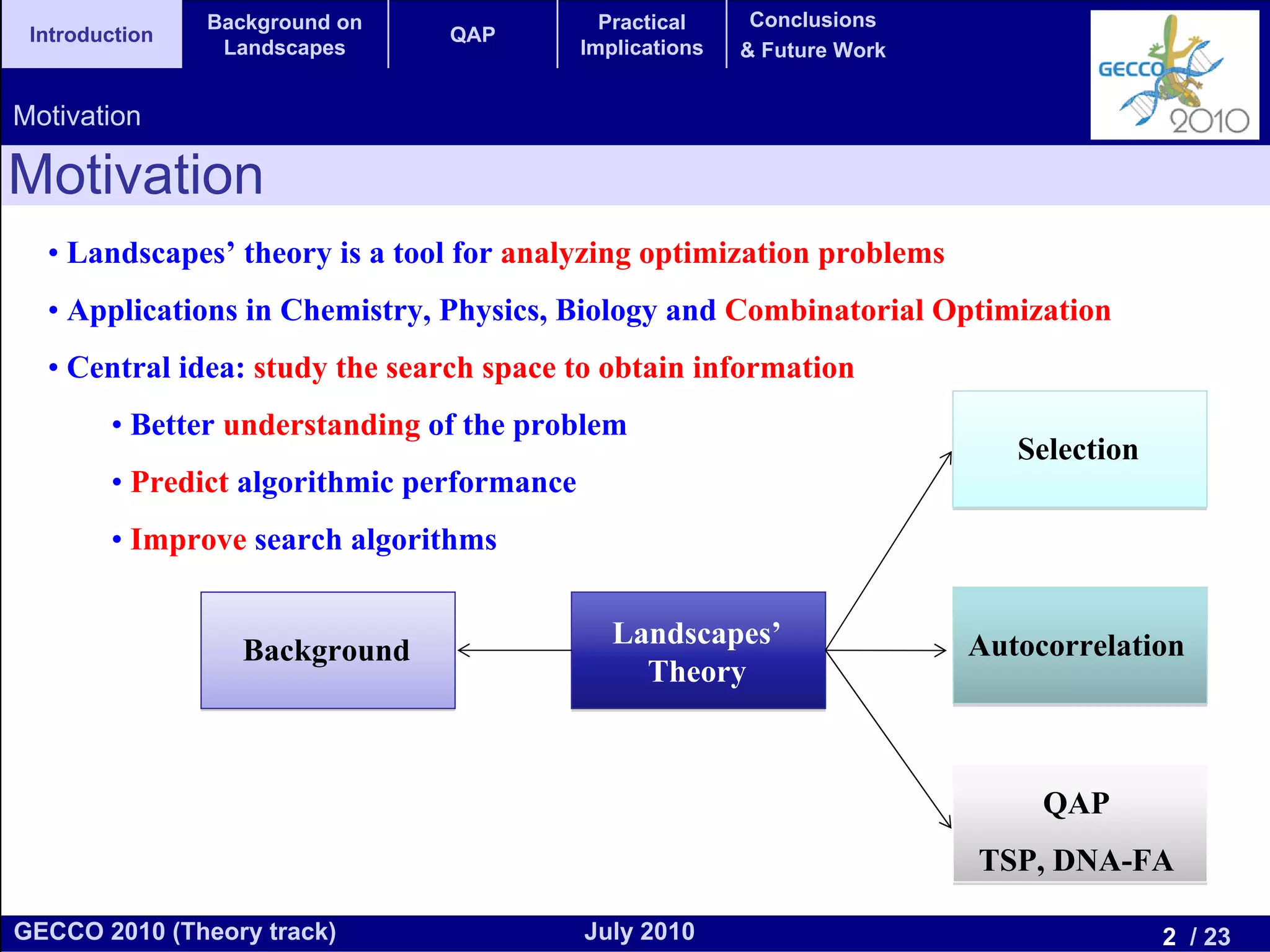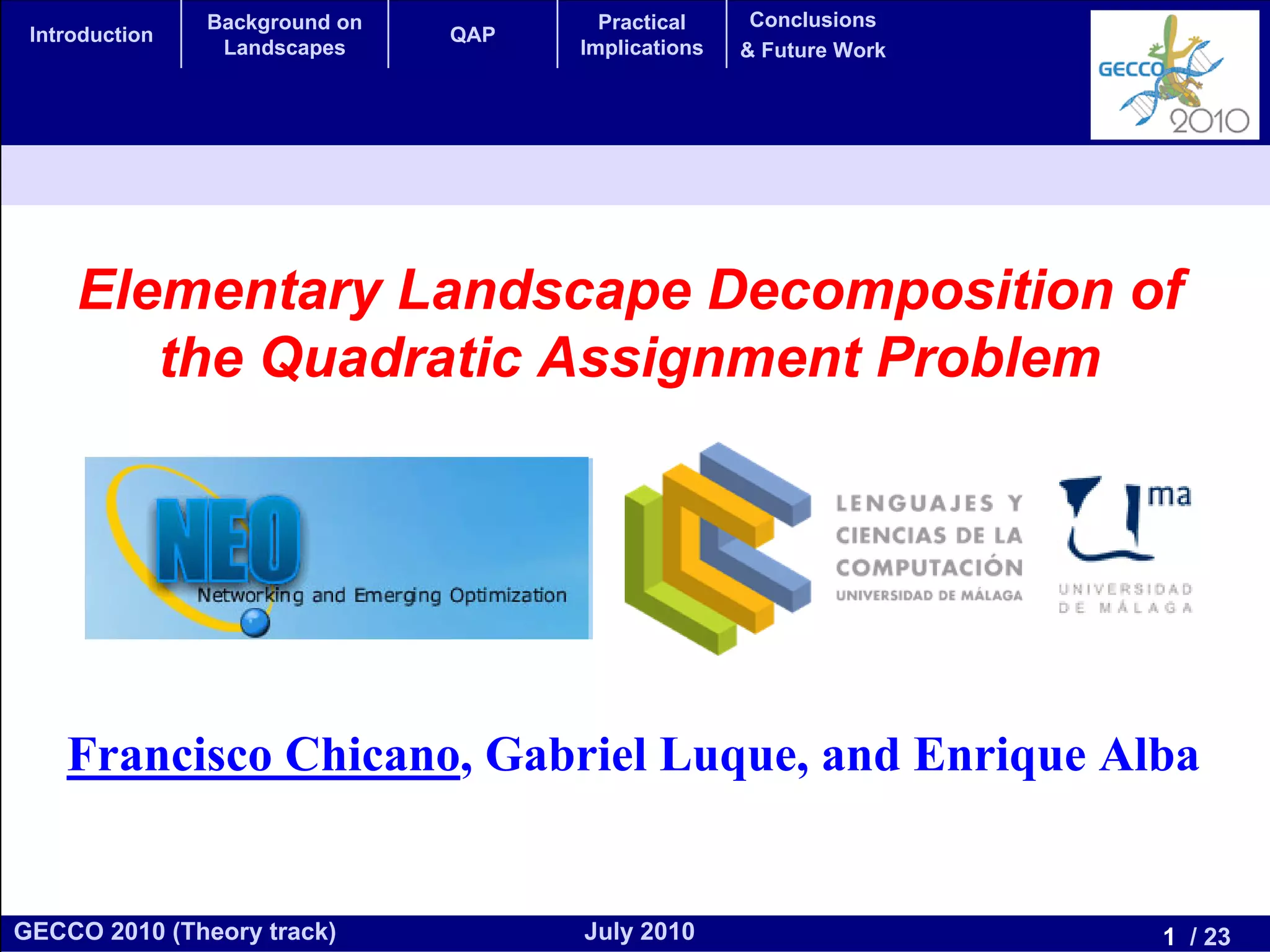 This document discusses the elementary landscape decomposition of the Quadratic Assignment Problem (QAP). It begins with background on landscape theory and definitions. It then shows that the QAP fitness function can be decomposed into three elementary components. It discusses how this decomposition allows estimating autocorrelation parameters to analyze problem structure. Finally, it notes the decomposition provides insights and can inform algorithm design, and discusses applications to related problems like the Traveling Salesman Problem and DNA fragment assembly.