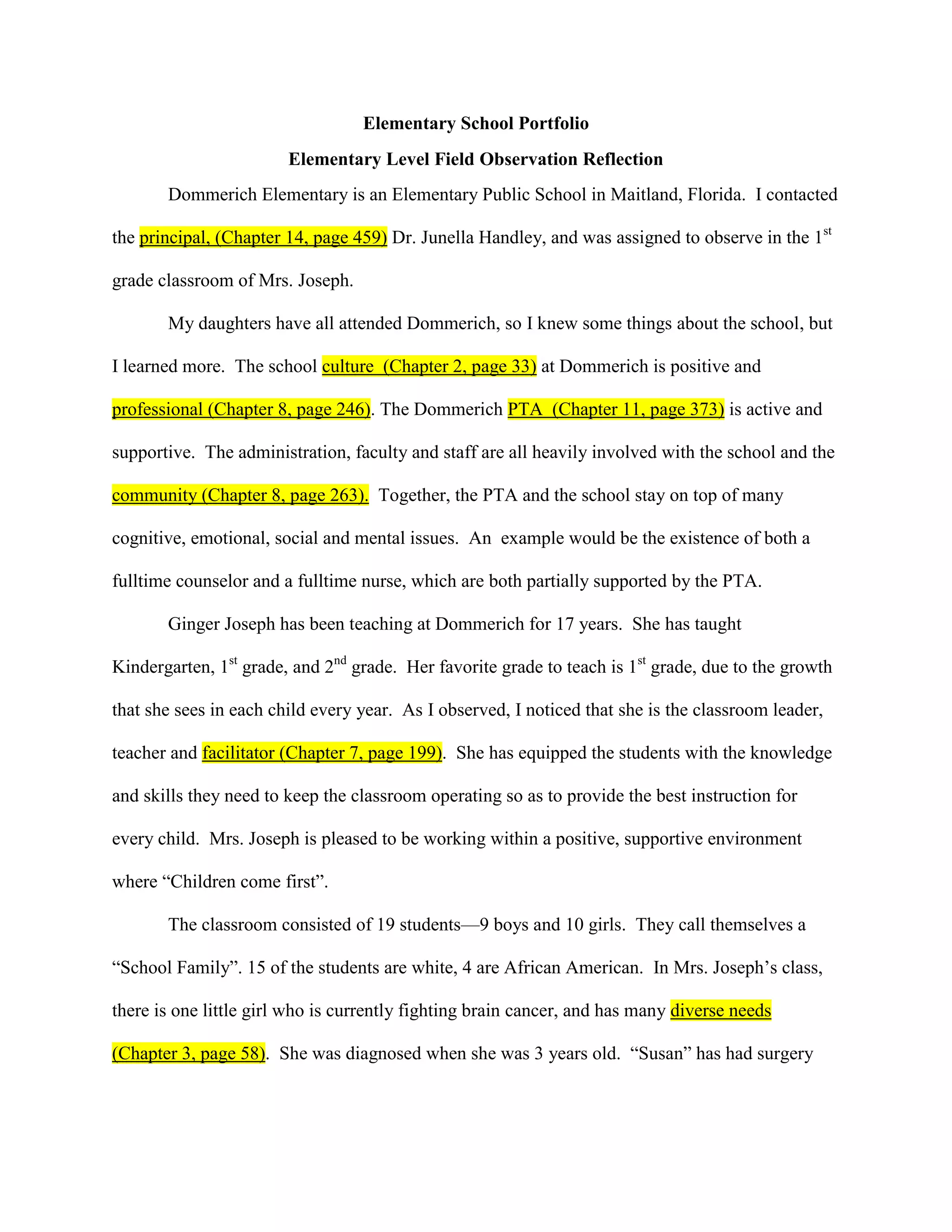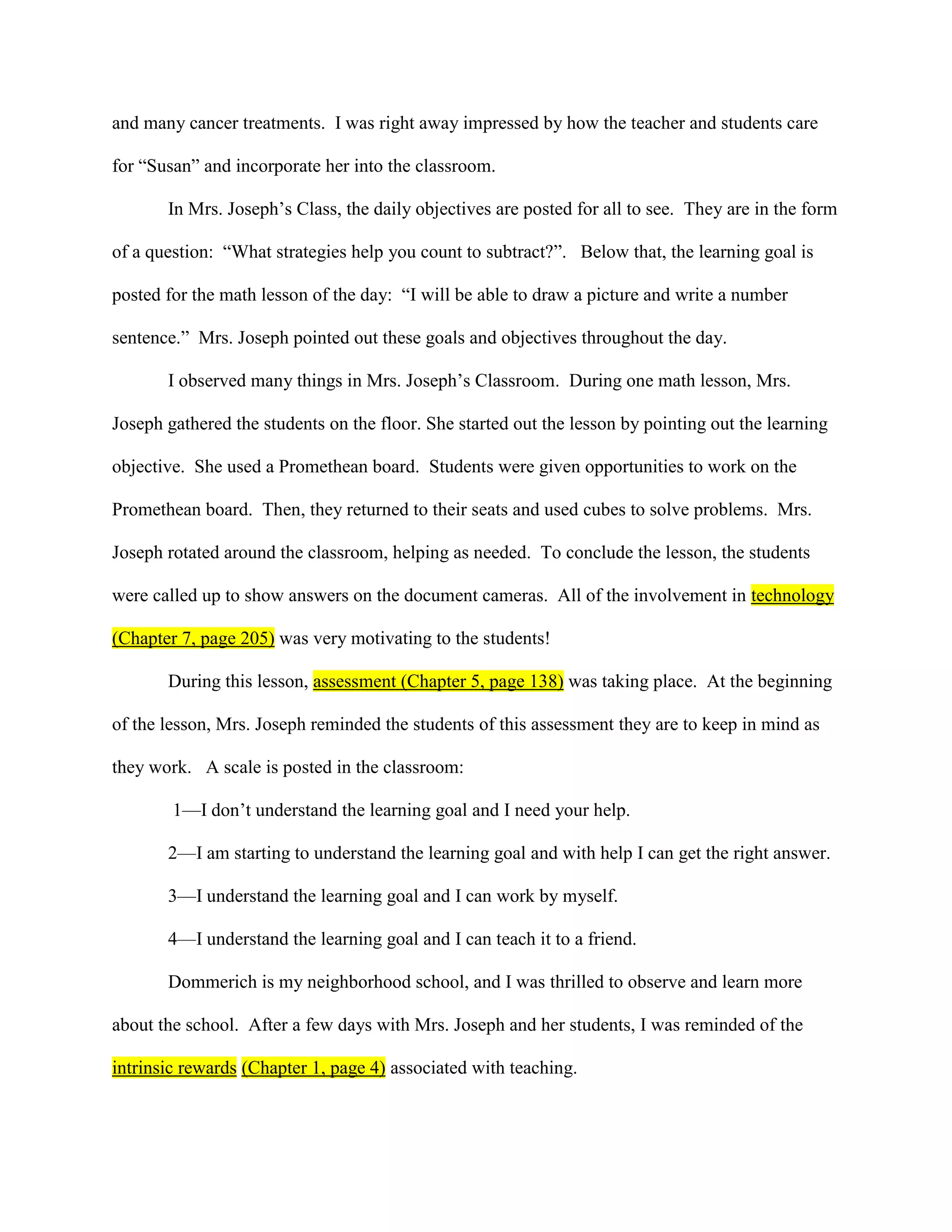 The document summarizes an observation of a 1st grade classroom at Dommerich Elementary School in Maitland, Florida. It describes the positive school culture and supportive PTA. It then focuses on describing Mrs. Joseph's 17 years of teaching experience, her classroom of 19 students, and her engaging math lesson that incorporated technology and assessment scales. The observation reminded the author of the rewards associated with teaching.