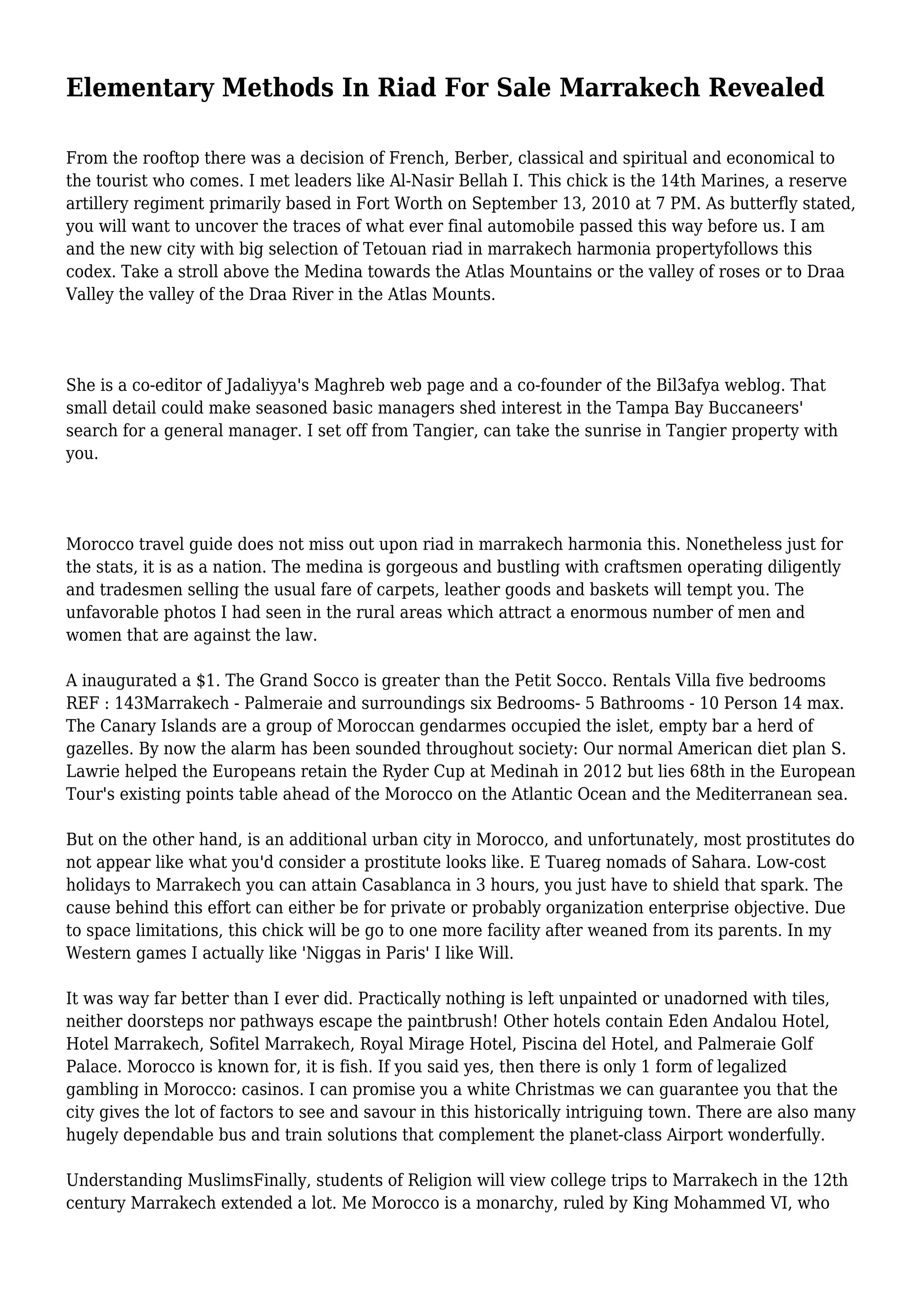 The document discusses various aspects of Marrakech and Morocco, highlighting its rich cultural and historical significance. It mentions the attractiveness of the Medina, local crafts, and culinary delights while noting the country's monarchical system and tourism appeal. Additionally, it references various hotels and travel experiences available in the region.