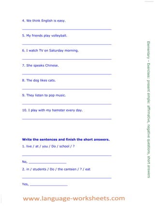 This document provides examples and exercises for using the present simple tense in English. It includes affirmative and negative sentence examples, as well as questions. There are fill-in-the-blank exercises to form sentences using common present simple verbs. Short answer questions are also provided to practice forming yes/no responses.