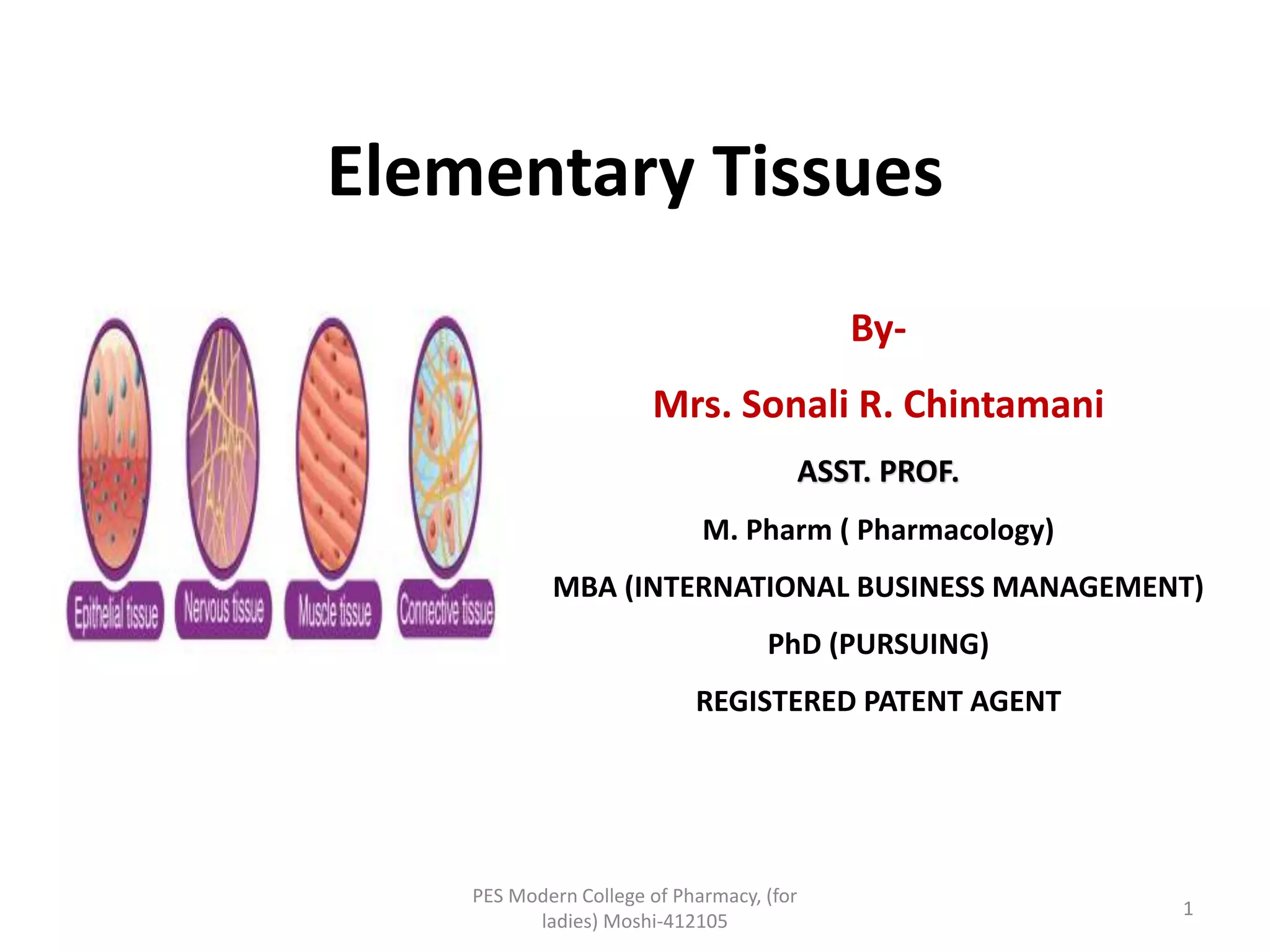 The document discusses the different types of tissues in the human body. It describes four main tissue types - epithelial tissue, connective tissue, muscular tissue, and nervous tissue. Each tissue type has multiple sub-types and serves distinct functions. The document provides detailed information on the characteristics, locations, and functions of different epithelial, connective, muscular, and nervous tissues.