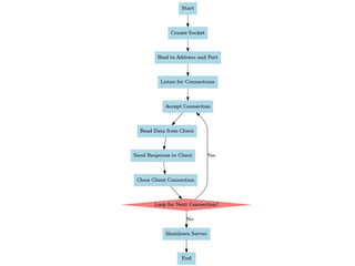 • Binding: The server binds the socket to a specific address and port using bind.