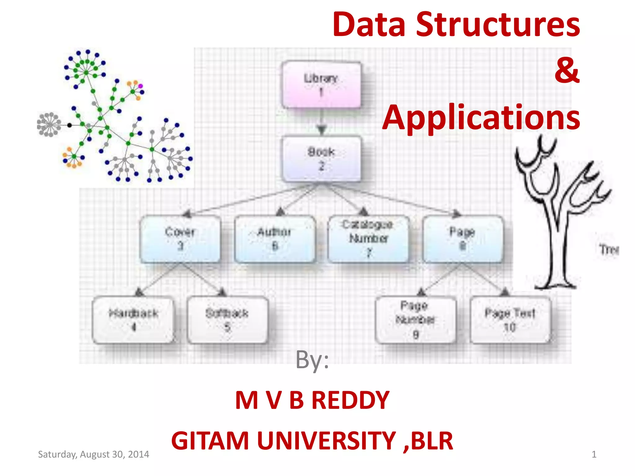 This document discusses data structures and algorithms. It begins by defining a data structure as the organized representation of data elements and relationships. It then discusses various data structures like arrays, lists, stacks, and queues. For each, it provides definitions and examples. It also includes C code examples to demonstrate implementing and using stacks and queues. The document is intended to teach fundamental data structures and their applications in algorithms.