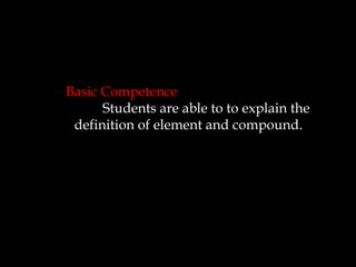Elements are pure substances that cannot be broken down further through chemical or physical means. There are currently 118 known elements, with new ones occasionally being discovered through artificial nuclear reactions. Elements are identified by their atomic number, which represents the number of protons in the nucleus. Elements are the basic building blocks of all matter and are used to create thousands of materials, though some like plutonium are also used in nuclear weapons due to their radioactive properties.