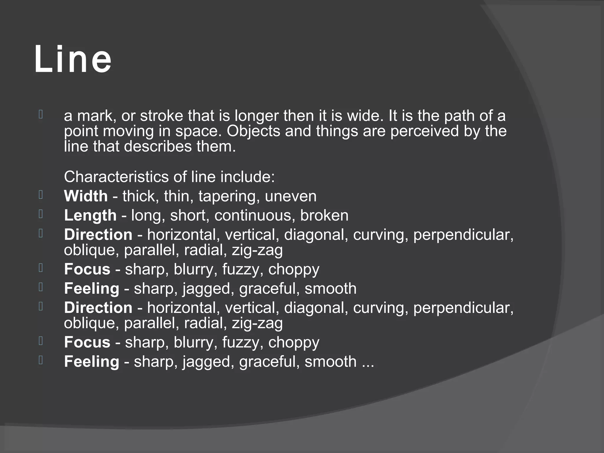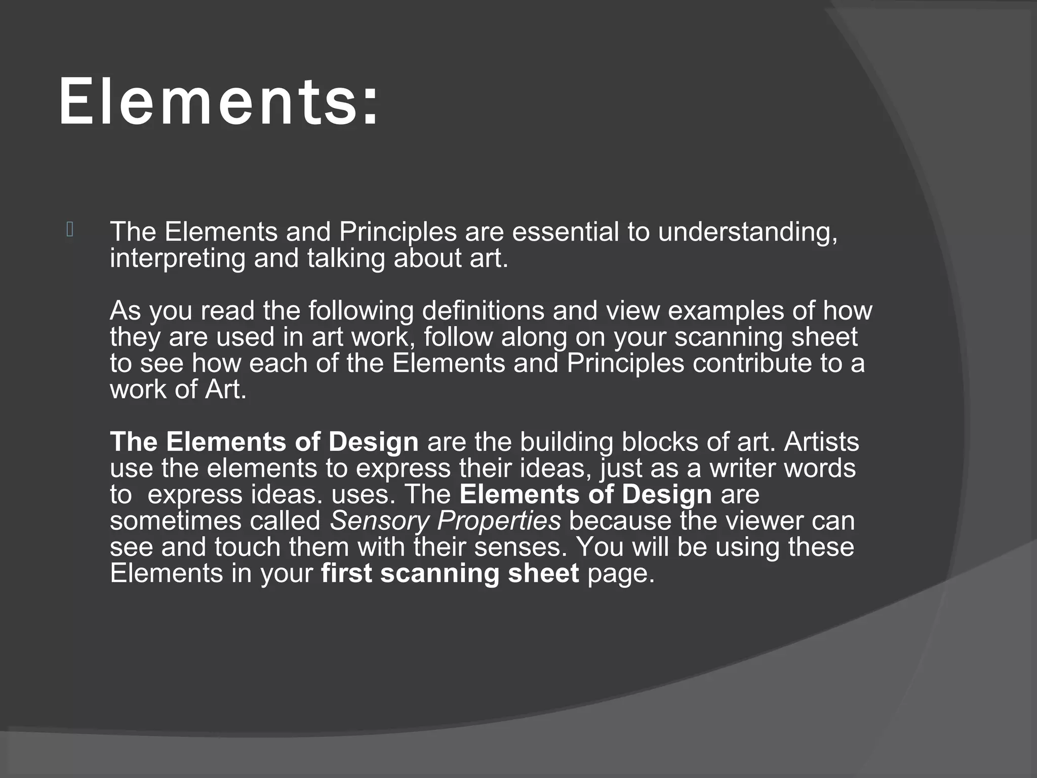 The document defines and provides examples of the elements and principles of art. It discusses the key elements of line, shape, form, color, texture, space and discusses their characteristics. It then explains the principles of balance, symmetry, asymmetry, repetition, unity, theme/variation, contrast, rhythm, and dominance. It concludes by briefly mentioning technical properties of art media and the expressive properties an artwork can convey such as mood, dynamic states, and ideas.