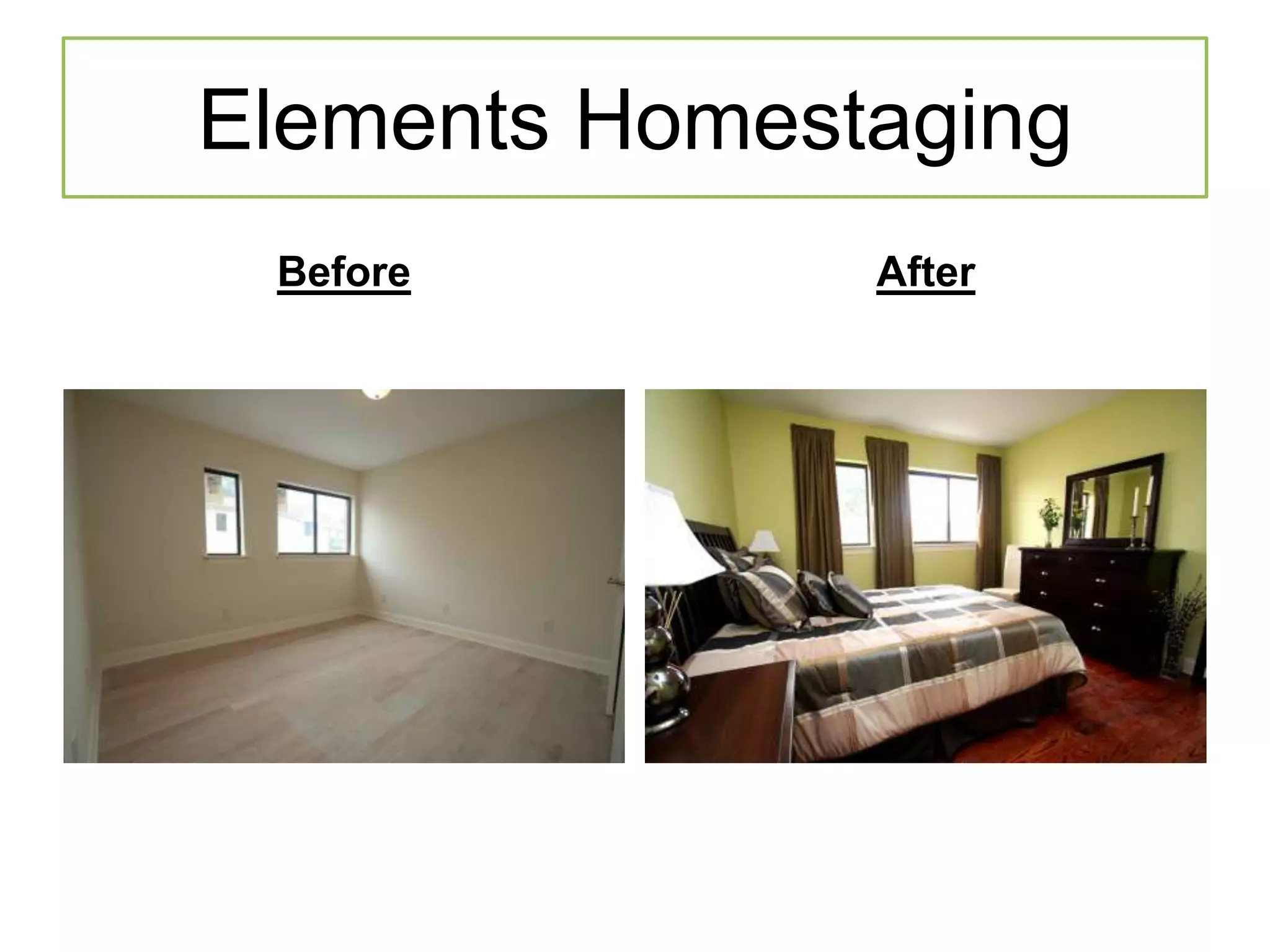 Elements Homestaging provides home staging services to help sell homes more quickly and for a higher price. They transform homes before being put on the market by decluttering, cleaning, and rearranging furniture to highlight the best features of the property. Elements also offers interior design services to fully renovate homes.