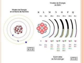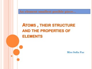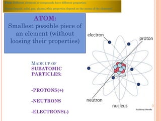 The document discusses the structure of atoms and the properties of elements. It states that atoms are made up of subatomic particles, including protons, neutrons, and electrons. The nucleus contains protons and neutrons, while electrons orbit the nucleus. The number of protons determines the element and is called the atomic number. Atoms can have different numbers of neutrons, forming isotopes of an element. The attraction between protons and electrons keeps the atom electrically neutral. The structure of atoms determines how elements react chemically.