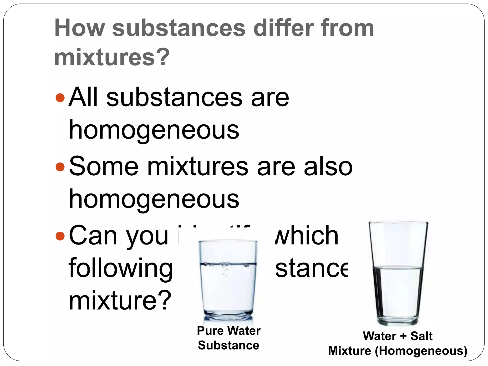 The document discusses the differences between substances and mixtures. Substances are homogeneous, meaning their composition is uniform throughout, while some mixtures are also homogeneous. Pure water is given as an example of a substance, while water mixed with salt is provided as an example of a homogeneous mixture. The key differences presented are that substances are uniform in composition while mixtures may have non-uniform compositions.