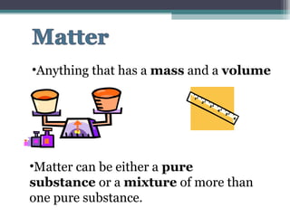 The document provides instructions to set up Cornell notes on specific pages of a textbook. It then summarizes key concepts about elements, compounds, and mixtures from a middle school science website. Specifically, it defines pure substances as materials made of only one type of atom that cannot be broken down further. Compounds are defined as pure substances made of two or more elements bound chemically. Physical and chemical changes are also briefly discussed. Animated images are included from additional websites to illustrate atomic structure and behavior.