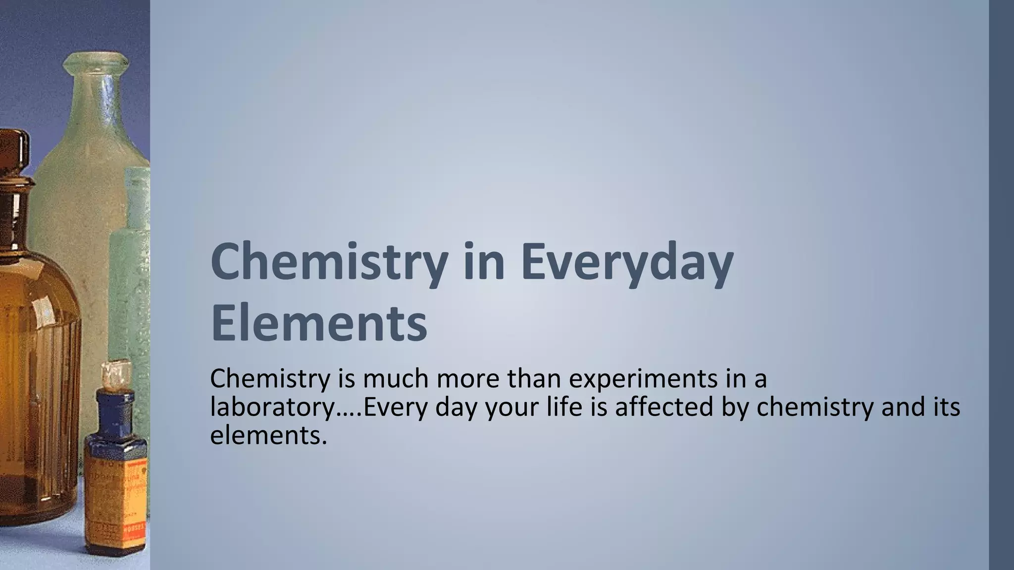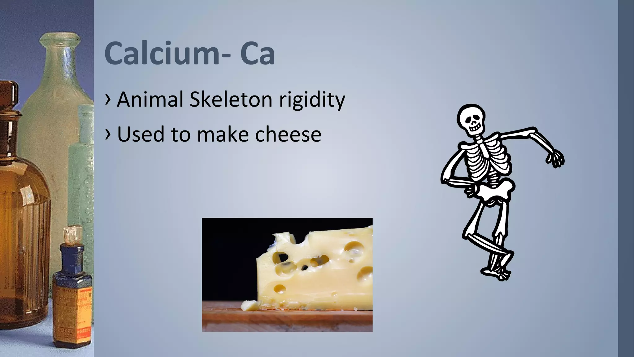 This document discusses several common elements and compounds found in everyday life, including their uses and importance. Calcium is important for bone structure and making cheese. Oxygen is essential for breathing and combustion. Carbon is the basis of all life on Earth and found in diamonds and plastics. Copper is used in wiring and helps absorb iron in the body. The document prompts the reader to research and illustrate the uses of 5 additional elements or compounds.