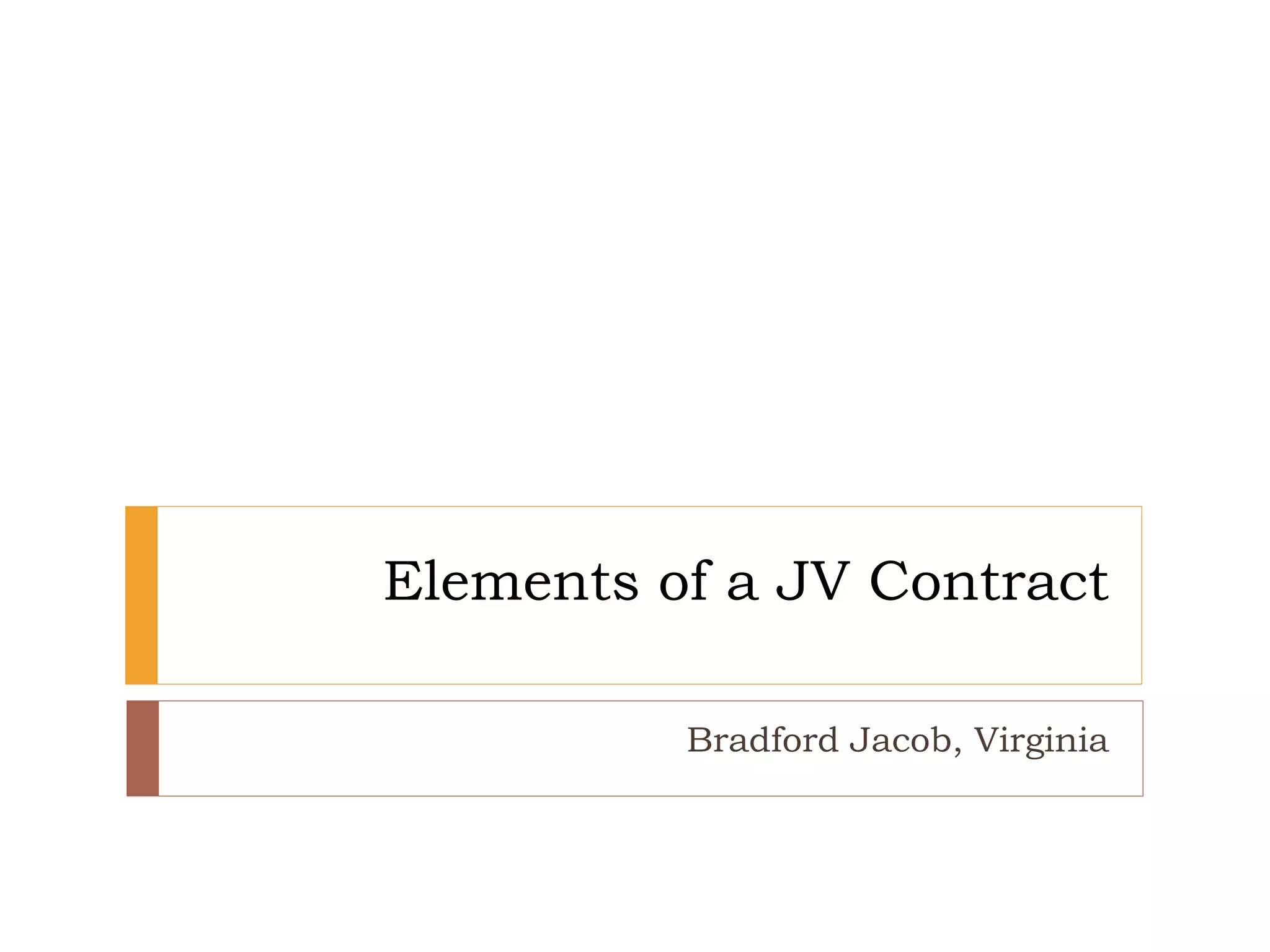 The document discusses the key elements that should be included in a joint venture (JV) contract. A JV contract is created when two or more companies combine resources to accomplish a task. The contract should precisely define the objective of the collaboration, clarify the initial financial contributions of each party, detail the operational obligations of both parties, and determine how profit and loss will be divided. The contract aims to map out the details of the joint venture arrangement to avoid future litigation between the partners.