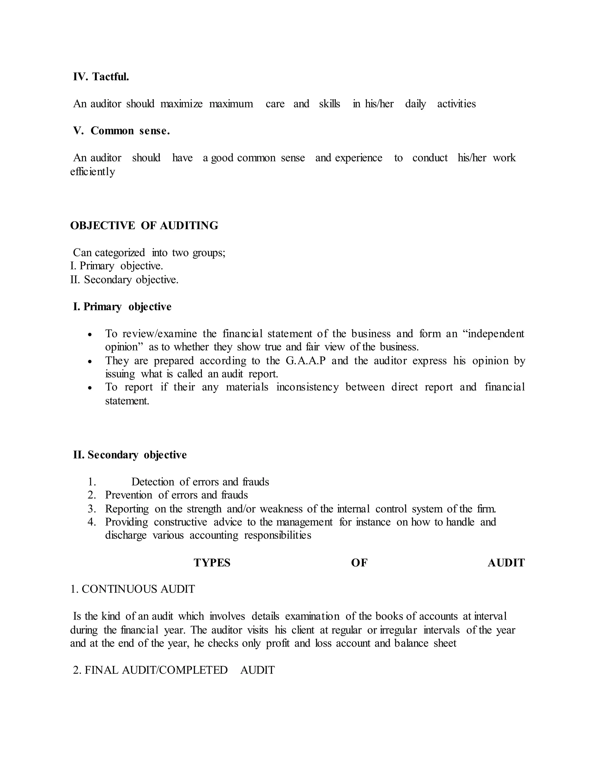 The document provides an extensive overview of auditing, detailing its definition, objectives, types of audits, and the qualifications and duties of auditors. It distinguishes between internal and external audits, outlining the roles and responsibilities of auditors, including the assessment of financial statements and the requirement for independence. Additionally, it highlights the internal control systems and processes necessary to ensure accuracy and accountability within an organization.