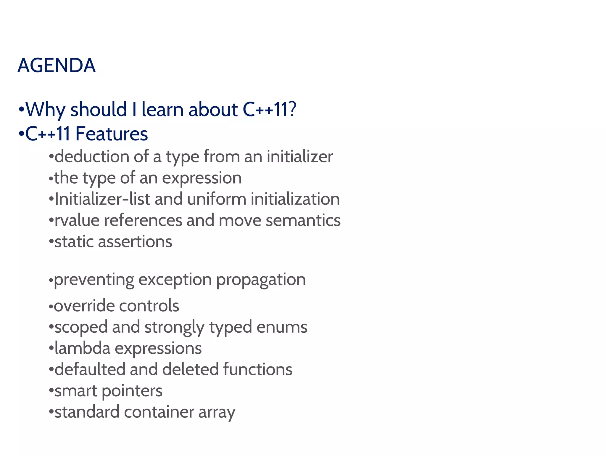 C++11 introduced many new features including type deduction with auto, uniform initialization syntax, rvalue references and move semantics, improved enums, lambda expressions, and smart pointers. Type deduction with auto lets the compiler deduce the type of a variable based on its initializer. Uniform initialization uses curly braces {} and allows narrowing conversions only if explicitly cast. Rvalue references and move semantics allow moving an object to avoid expensive copies by leaving the source object in a valid but unspecified state.