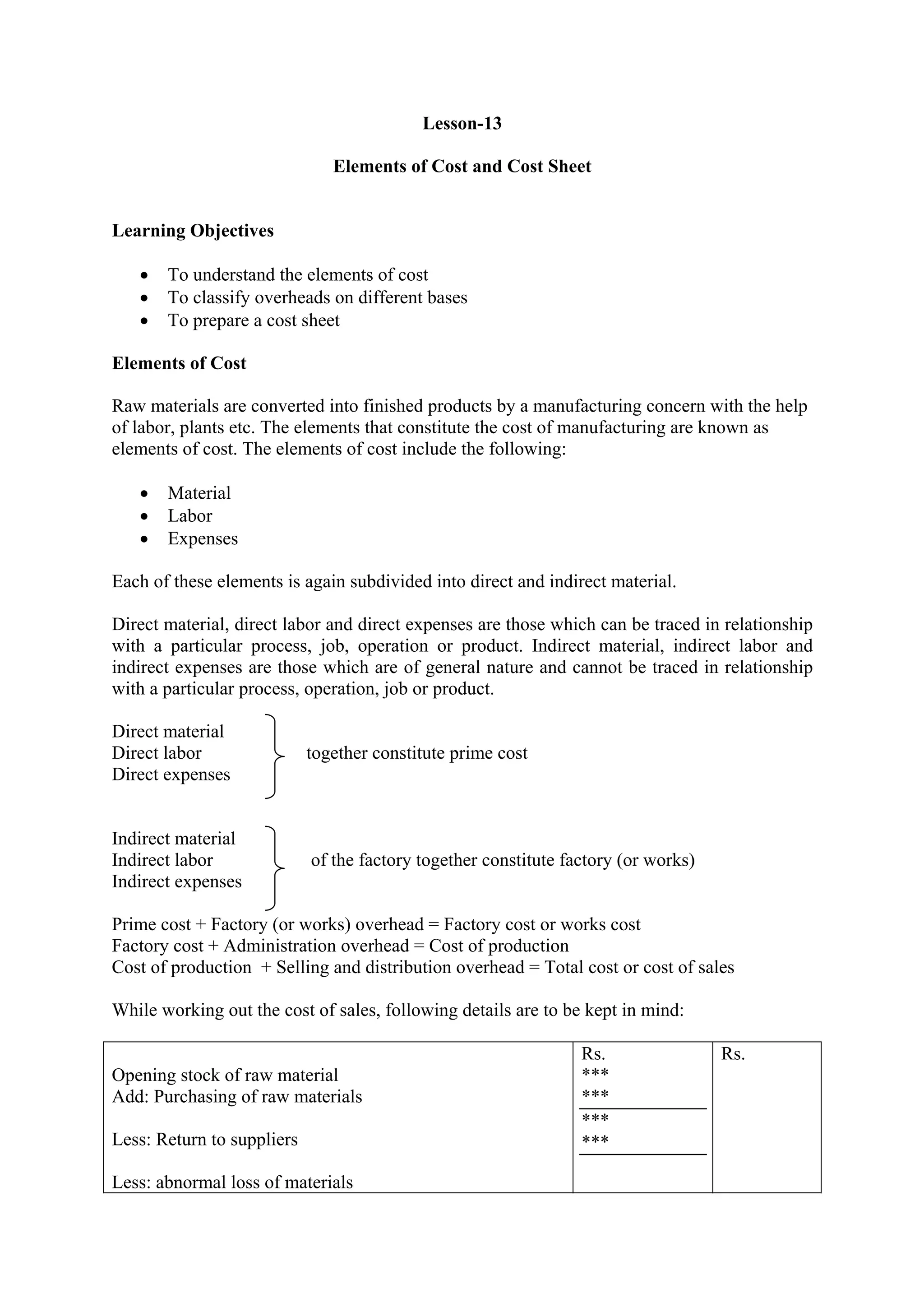 The document outlines the elements of cost in manufacturing, detailing direct and indirect costs including materials, labor, and various overhead expenses. It also classifies costs into fixed, variable, and semi-variable categories, emphasizing the importance of understanding cost behavior for accurate financial analysis. Multiple problem examples illustrate how to prepare cost sheets and analyze manufacturing costs.