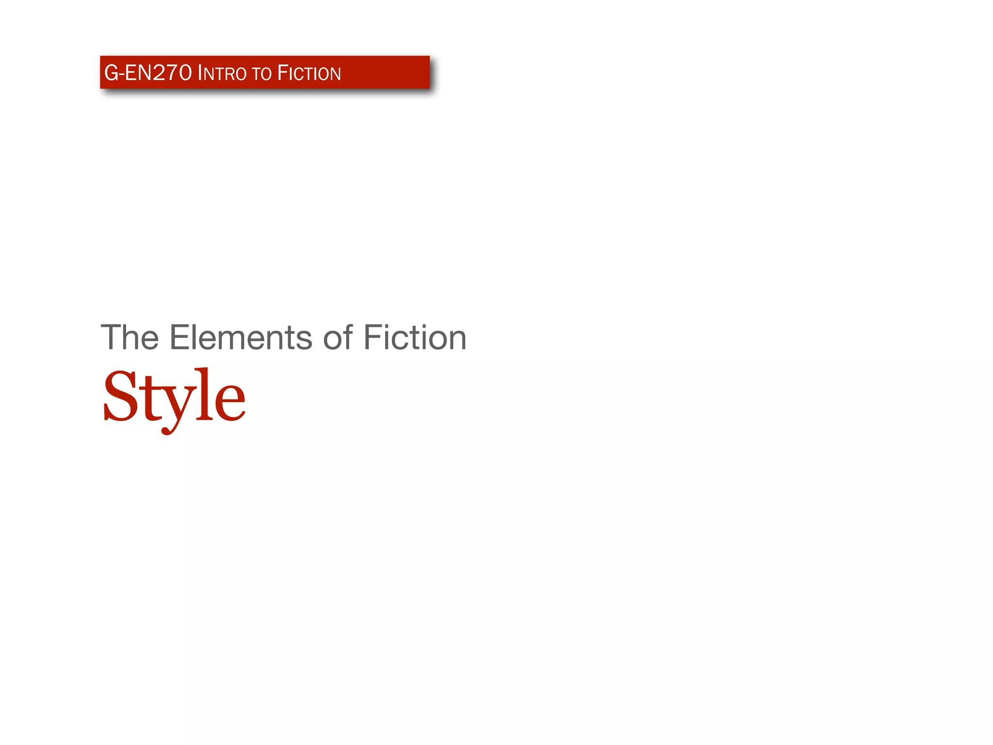 The document discusses the element of style in fiction writing. It defines style as a writer's technical handling of language, including their choice of words (diction), sentence structure (syntax), and organization of paragraphs. Style also encompasses rhythm, tone, imagery, and symbolism. The writer's full use of these elements constitutes their unique voice. Point of view and dialogue can further influence a writer's style by shaping the narrative voice.