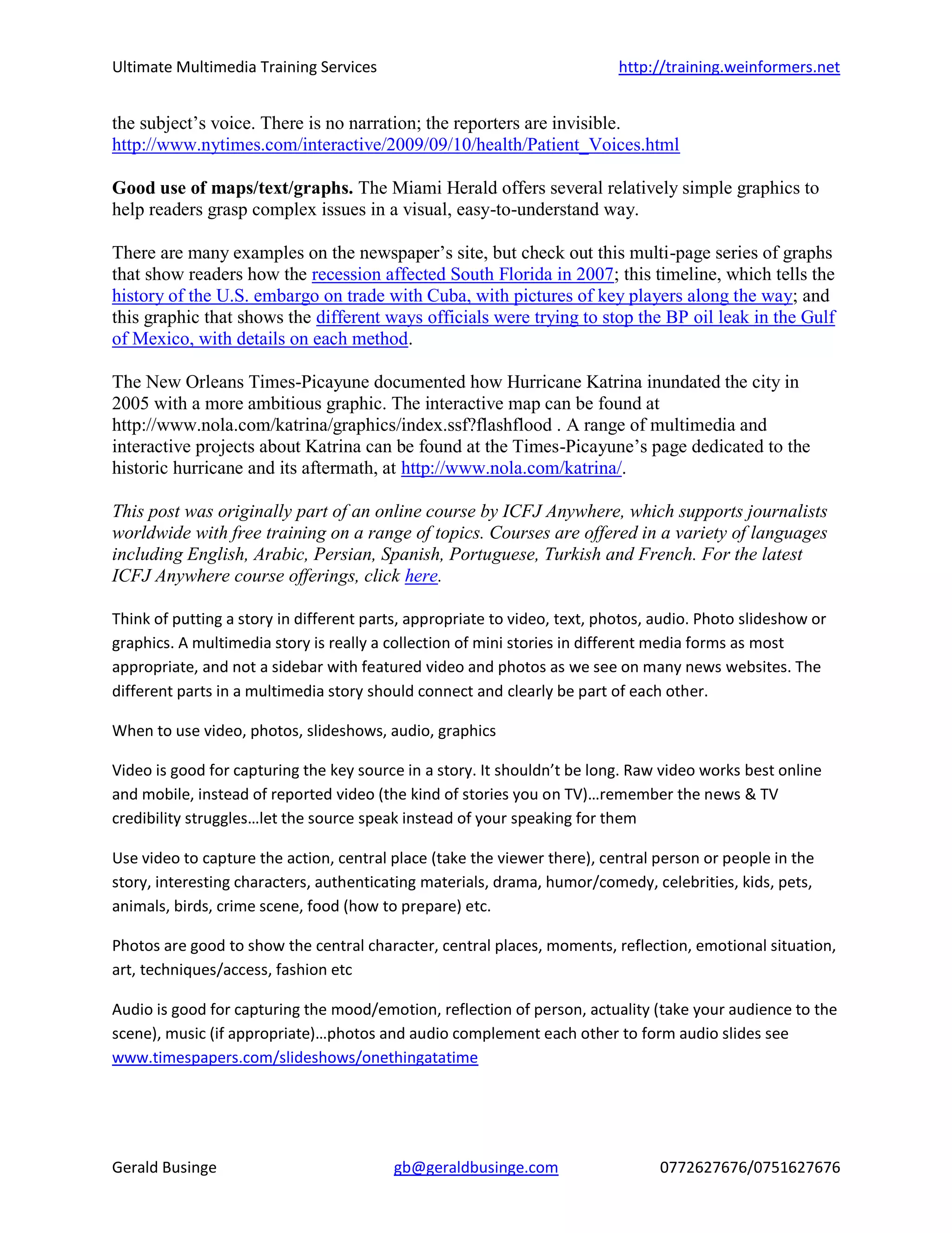 This document provides guidance on elements of good multimedia storytelling. It discusses combining different media like video, photos, audio, and graphics to tell a more complete story. Each medium has strengths - video to show action, photos to capture emotion, audio for ambient sounds or compelling quotes, and graphics to illustrate complex processes or data. Examples are given of news outlets that effectively blend media like a slideshow of abandoned foreclosed homes or personal audio accounts of living with medical conditions. The key is including different mini-stories in the most appropriate media to connect all parts of the multimedia story.