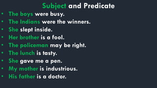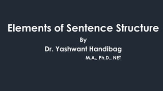 The document outlines key elements of sentence structure, focusing on subjects, verbs, objects, complements, and adverbials. It provides definitions and examples for each component, emphasizing their roles and relationships within sentences. The content serves as a foundational guide for understanding and constructing grammatically correct sentences.