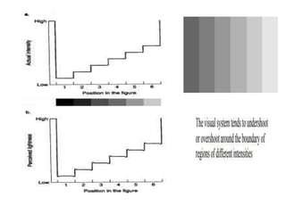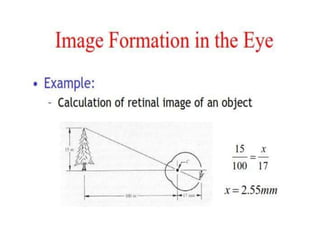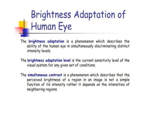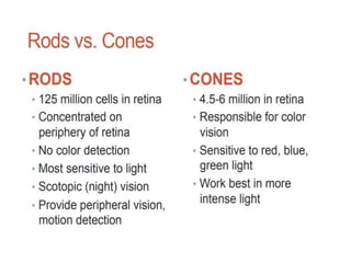 The human visual system allows us to see and understand our environment. It consists of the eye, which contains structures like the cornea, iris, lens, retina, and specialized photoreceptor cells called rods and cones. The eye transforms light into neural signals that travel to the brain for processing. Human visual perception relies on both rods for dim light vision and cones for bright light and color vision. The density and connections of rods and cones in the retina allow for varying levels of visual acuity and light sensitivity. The lens focuses images onto the retina, where photoreceptors convert the images into signals the brain can interpret as vision.