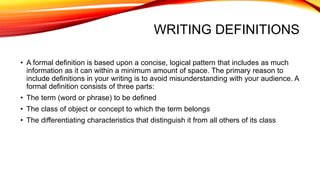 This document provides guidance on various elements of academic writing, including definitions, discussion essays, generalizations, numbers, opening paragraphs, and introductions. It explains that definitions should define a term, the class it belongs to, and distinguishing characteristics. Discussion essays should balance both sides of an issue and clearly separate facts from opinions. Generalizations require support with examples. Numbers should follow rules about when to use words or numerals. Opening paragraphs should establish context and orient the reader to the topic and central question. Introductions can begin broadly and funnel down to the specific topic or start directly with the focus.