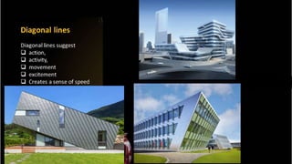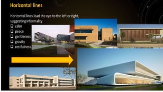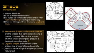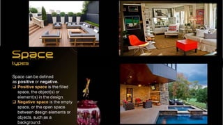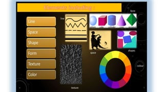 This document discusses elements and principles of design. It outlines different colors and their common associations - black with authority, white with innocence, red with passion, green with wealth and nature, blue with peace, and purple with luxury. It then explains principles of design including balance, rhythm, emphasis, contrast, and unity. Symmetrical and asymmetrical balance as well as radial balance are defined. Scale and proportion relate to the size and shape of elements. Rhythm involves repetition. Emphasis creates focal points while contrast puts elements in opposition. Unity occurs when all elements work together cohesively.