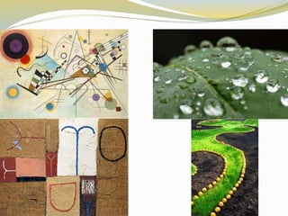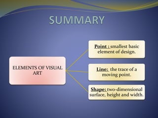 Point is the smallest element of design, line is a moving point, and shape is a two-dimensional surface with height and width. The elements of art like points, lines, and shapes are used to represent forms and produce different visual sensations such as hair, skin, light, and textures of materials.
