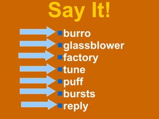 The document is a story about a glassblower named Elena. It describes Elena humming a tune to herself as she works. The glassblower used her skills to make a glass vase to sell at the fair. The document also provides vocabulary words and sentences using those words, including tune, glassblower, reply, burro, puff, factory, and bursts.
