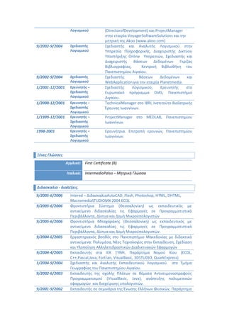 Βιογραφικό Σημείωμα<br />ΠροσωπικάΣτοιχεία.<br />Ονοματεπώνυμο:Ελένη ΡόκουΤηλέφωνο: 6948879026Διεύθυνση:Κρουαζέ 12, Πολύγωνο, ΑθήναΕ-mail:erokou@gmail.com Ημερομηνία Γέννησης24 Μαρτίου 1980Οικογενειακή ΚατάστασηΈγγαμη <br />Σπουδές<br />2009- Υποψήφιος ΔιδάκτοραςΕΘΝΙΚΟ ΜΕΤΣΟΒΙΟ ΠΟΛΥΤΕΧΝΕΙΟ ΣΧΟΛΗ ΜΗΧΑΝΟΛΟΓΩΝ ΜΗΧΑΝΙΚΩΝ ΤΟΜΕΑΣ BΙΟΜΗΧΑΝΙΚΗΣ ΔΙΟΙΚΗΣΗΣ ΚΑΙ EΠΙΧ. ΈΡΕΥΝΑΣΔιδακτορική Εργασία: «Πολυκριτήρια Συστήματα Αποφάσεων στη Διοίκηση Έργων»2009Μεταπτυχιακό Δίπλωμα ΠΑΝΕΠΙΣΤΗΜΙΟ ΑΙΓΑΙΟΥ ΣΧΟΛΗ ΕΠΙΣΤΗΜΩΝ ΤΗΣ ΔΙΟΙΚΗΣΗΣΤΜΗΜΑ ΜΗΧΑΝΙΚΩΝ ΟΙΚΟΝΟΜΙΑΣ ΚΑΙ ΔΙΟΙΚΗΣΗΣΜΕΤΑΠΤΥΧΙΑΚΟ ΠΡΟΓΡΑΜΜΑ ΣΠΟΥΔΩΝ«ΟΙΚΟΝΟΜΙΚΗ ΚΑΙ ΔΙΟΙΚΗΣΗ ΓΙΑ ΜΗΧΑΝΙΚΟΥΣ»Διπλωματική Εργασία: «Ανάπτυξη λογισμικού υποστήριξης διαδικασίας δικτυακής ανάλυσης για την αξιολόγηση χαρτοφυλακίου έργων»Βαθμός 9,23/102002ΠτυχίοΠΑΝΕΠΙΣΤΗΜΙΟ ΙΩΑΝΝΙΝΩΝΣΧΟΛΗ ΘΕΤΙΚΩΝ ΕΠΙΣΤΗΜΩΝΤΜΗΜΑ ΠΛΗΡΟΦΟΡΙΚΗΣΔιπλωματική Εργασία: «Σχεδίαση και Ανάπτυξη συστήματος για την τηλεπαρακολούθηση παιδιών με άσθμα και την εν γραμμή επιμόρφωση γονέων και παιδιών»Βαθμός 6,22/101997Απολυτήριο Λυκείου2ο ΓΕΝΙΚΟ ΛΥΚΕΙΟ ΧΙΟΥΒαθμός 19,8/20<br />Επαγγελματική Εμπειρία.<br />9/2008-6/2009Διαχείριση Έργων ΠληροφορικήςΣυμβουλευτικές και διαχειριστικές υπηρεσίες στην εταιρία Π.Βασιλάκης -ΟΠΣΝΑ και Δημοτικές Διαδυκτιακές Πύλες, υπό την αιγίδα της εταιρίας Unisystem – InfoQuest3/2006-6/2008Διαχείριση Έργων Πληροφορικής & Σχεδίαση ΛογισμικούΣχεδιαστής και Αναλυτής Λογισμικού, Διευθύντρια του τμήματος ανάπτυξης εφαρμογών (Director of Development) και Project Manager στην εταιρία Voyager Software Solutions και την μητρική της Akoo (www.akoo.com)9/2002-9/2004Σχεδιαστής ΛογισμικούΣχεδιαστής και Αναλυτής Λογισμικού στην Υπηρεσία Πληροφορικής, Διαχειριστής Δικτύου Υποστήριξης On line Υπηρεσιών, Σχεδιαστής και Διαχειριστής Βάσεων Δεδομένων Γκρίζας Βιβλιογραφίας, Κεντρική Βιβλιοθήκη του Πανεπιστημίου Αιγαίου.9/2002-9/2004Σχεδιαστής ΛογισμικούΣχεδιαστής Βάσεων Δεδομένων και Web Application για την εταιρία Planetmedia.1/2001-12/2001Ερευνητής – Σχεδιαστής ΛογισμικούΣχεδιαστής Λογισμικού, Ερευνητής στο Ευρωπαϊκό πρόγραμμα DIAS, Πανεπιστήμιο Αιγαίου.1/2000-12/2001Ερευνητής – Σχεδιαστής ΛογισμικούTechnical Manager στο IBRI, Ινστιτούτο Βιοΐατρικής Έρευνας Ιωαννίνων. 1/1999-12/2001Ερευνητής – Σχεδιαστής ΛογισμικούProject Manager στο MEDLAB, Πανεπιστημίου Ιωαννίνων.1998-2001Ερευνητής – Σχεδιαστής ΛογισμικούΕρευνήτρια. Επιτροπή ερευνών, Πανεπιστημίου Ιωαννίνων.<br />Ξένες Γλώσσες<br />Αγγλικά:First Certificate (B)Ιταλικά: Intermedio Palso – Μητρική Γλώσσα<br />Διδασκαλία - διαλέξεις.<br />9/2005-6/2006Ιntered – Διδασκαλία ΑutoCAD, Flash, Photoshop, HTML, DHTML, Macromedia STUDIO MX 2004 ECDL9/2005-6/2006Φροντιστήρια Σύστημα (Θεσσαλονίκη) ως εκπαιδευτικός με αντικείμενο διδασκαλίας τις Εφαρμογές σε Προγραμματιστικά Περιβάλλοντα, Δίκτυα και Δομή Μικροϋπολογιστών9/2005-6/2006Φροντιστήρια Μπαχαράκης (Θεσσαλονίκη) ως εκπαιδευτικός με αντικείμενο διδασκαλίας τις Εφαρμογές σε Προγραμματιστικά Περιβάλλοντα, Δίκτυα και Δομή Μικροϋπολογιστών.9/2004-6/2005Εργαστηριακός βοηθός στο Πανεπιστήμιο Μακεδονίας με διδακτικά αντικείμενα: Πολυμέσα, Νέες Τεχνολογίες στην Εκπαίδευση, Σχεδίαση και Υλοποίηση Αλληλεπιδραστικών Διαδικτυακών Εφαρμογών9/2004-4/2005Εκπαιδευτής στα ΙΕΚ ΞΥΝΗ, Παράρτημα Νομού Χίου (ECDL, C++,Pascal,Java, Fortran, Visual Basic, 3D STUDIO, Quark Express)1/2004-9/2004Σχεδιαστής και Αναλυτής Εκπαιδευτικού Λογισμικού στο Τμήμα Γεωγραφίας του Πανεπιστημίου Αιγαίου.9/2002-6/2003Εκπαιδευτής της σχολής Πλάτων σε θέματα Αντικειμενοστραφούς Προγραμματισμού (Visual Basic, Java), ανάπτυξης πολυμεσικών 