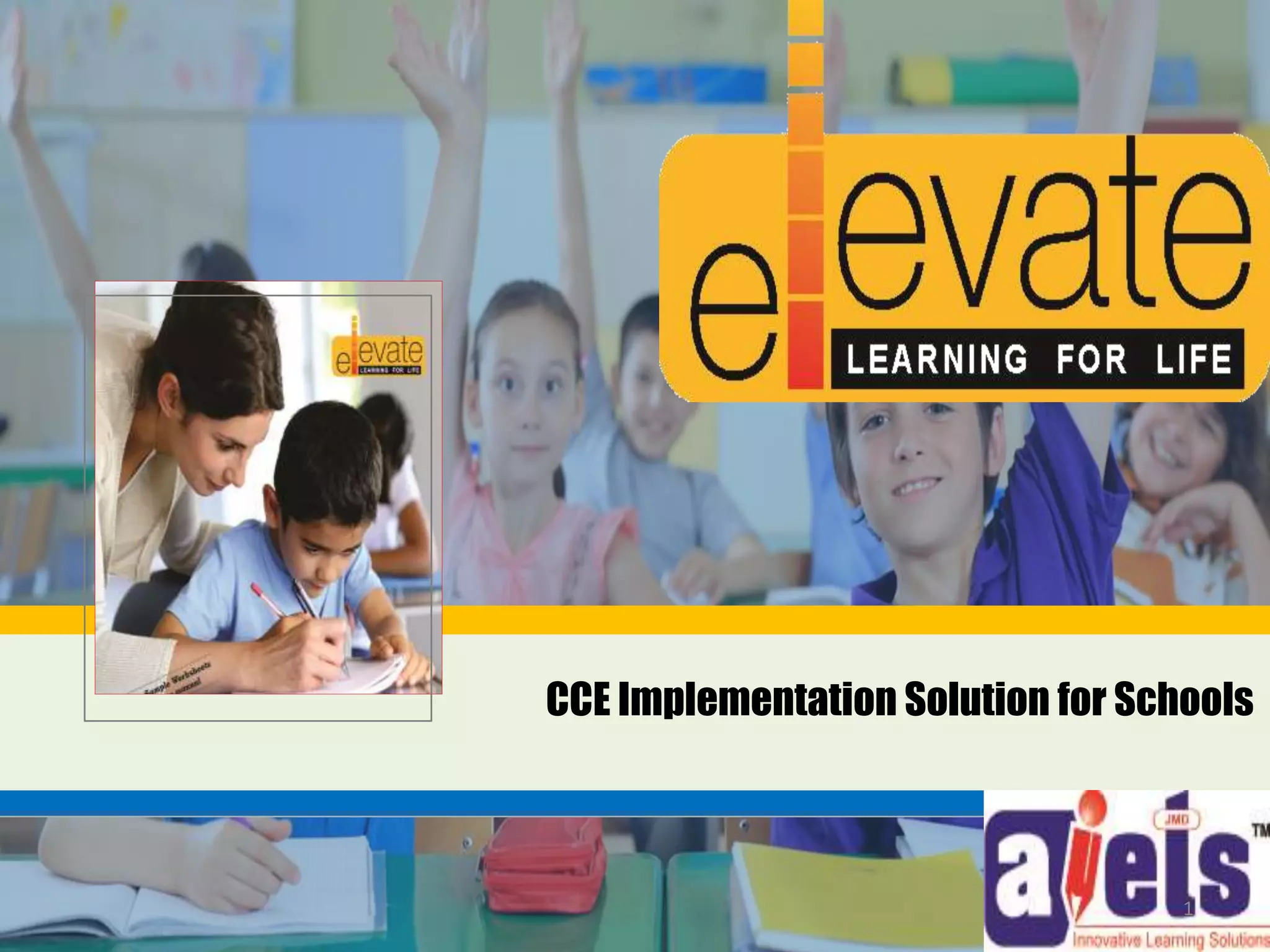 AIETS is an education company that provides learning and assessment solutions. It introduces Elevate, a set of activity-based worksheets that help implement continuous and comprehensive evaluation (CCE) in schools. Elevate includes student workbooks, a teacher manual, curriculum planner, and teacher training workshops. The worksheets connect classroom learning to real-life experiences through various assessment techniques. Elevate provides a complete and cost-effective CCE solution for schools.