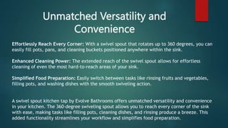 In today's modern kitchen, functionality is key. A swivel spout kitchen tap from Evolve Bathrooms can significantly enhance your kitchen's efficiency and ease of use. For more info kindly read this PPT.
